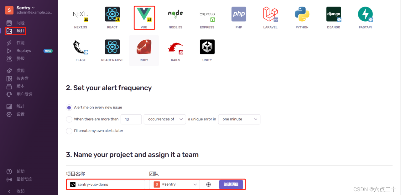 Sentry中项目接入的类型有很多,以Vue 项目示范: