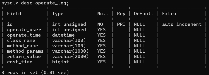 import org.apache.ibatis.annotations.Insert; import org.apache.ibatis.annotations.Mapper; import org.example.Pojo.OperateLog; @Mapper public interface AOPMapper { @Insert("insert into operate_log(operate_time,class_name,method_name,method_params,return_value,cost_time) " + "values (#{operateTime},#{className},#{methodName},#{methodParams},#{returnValue},#{costTime})") public void log(OperateLog operateLog); }