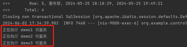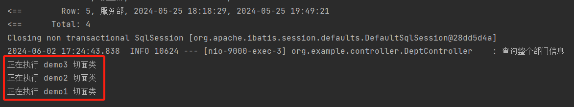 import org.aspectj.lang.ProceedingJoinPoint; import org.aspectj.lang.annotation.Around; import org.aspectj.lang.annotation.Aspect; import org.springframework.stereotype.Component; @Component @Aspect public class demo2 { @Around("execution(* org.example.controller.DeptController.getList())") public Object demo(ProceedingJoinPoint joinPoint) throws Throwable { System.out.println("正在执行 demo2 切面类"); Object result = joinPoint.proceed(); System.out.println("正在执行 demo2 切面类"); return result; } }demo3 切面类: