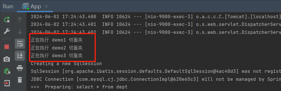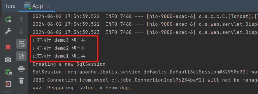 import org.aspectj.lang.ProceedingJoinPoint; import org.aspectj.lang.annotation.Around; import org.aspectj.lang.annotation.Aspect; import org.springframework.stereotype.Component; @Component @Aspect public class demo3 { @Around("execution(* org.example.controller.DeptController.getList())") public Object demo(ProceedingJoinPoint joinPoint) throws Throwable { System.out.println("正在执行 demo3 切面类"); Object result = joinPoint.proceed(); System.out.println("正在执行 demo3 切面类"); return result; } }运行结果: