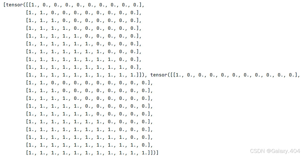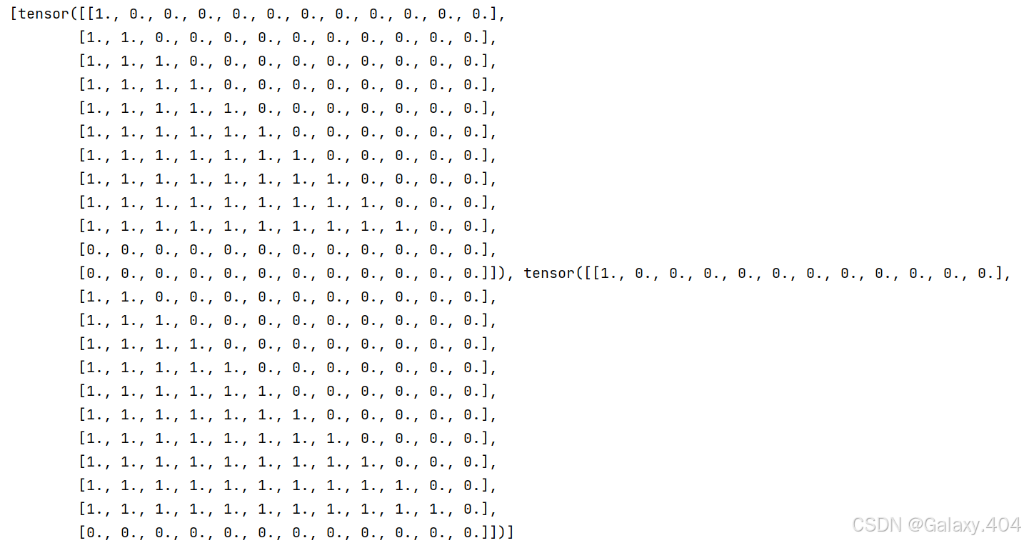 valid_decoder_tri_matrix = torch.cat([torch.unsqueeze(F.pad(torch.tril(torch.ones(L, L)), (0, max_tgt_seg_len-L, 0, max_tgt_seg_len-L)),0) for L in tgt_len]) 后续掩码过程还是跟前两篇一样,这里也不多解释了: