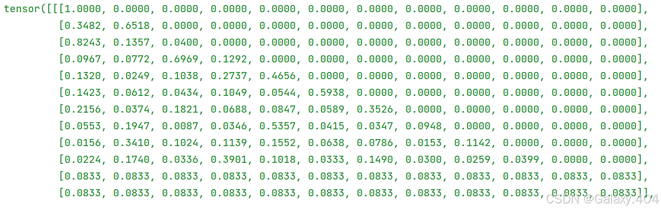 invalid_decoder_tri_matrix = 1 - valid_decoder_tri_matrix mask_decoder_self_attention = invalid_decoder_tri_matrix.to(torch.bool) score2 = torch.randn(batch_size, max_tgt_seg_len, max_tgt_seg_len) mask_score3 = score2.masked_fill(mask_decoder_self_attention, -1e9) prob3 = F.softmax(mask_score3, -1)