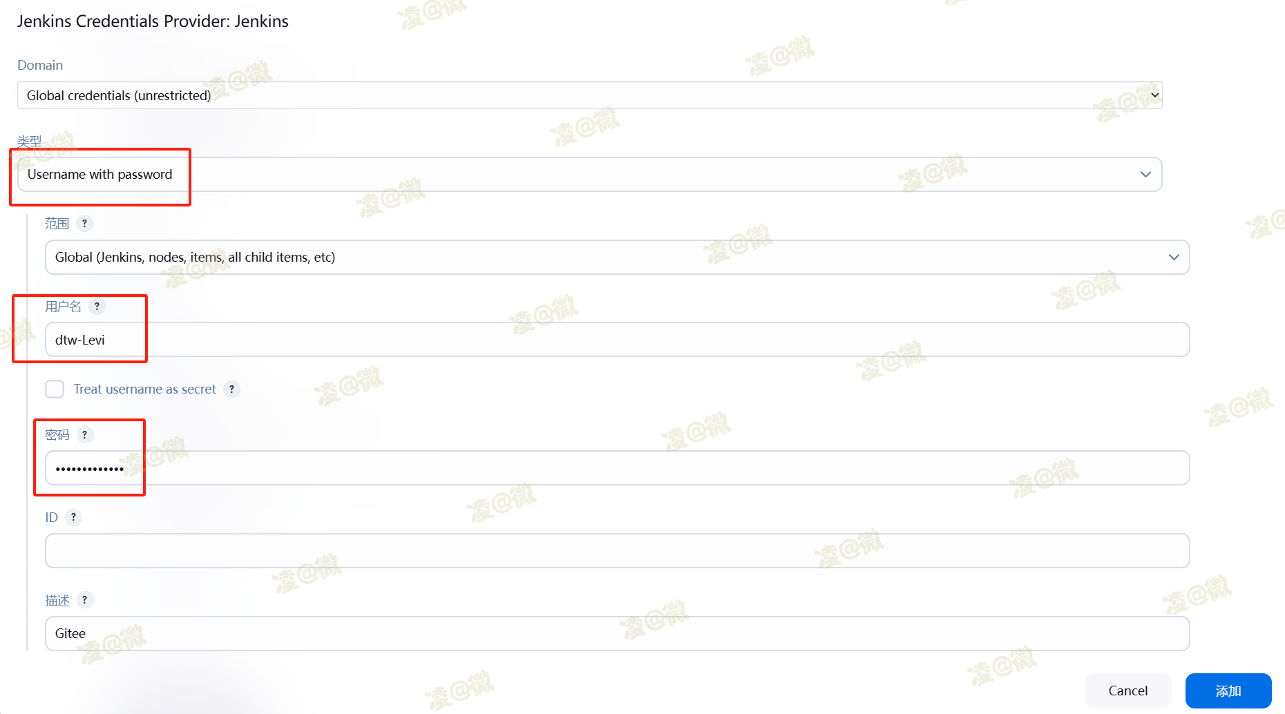 如果不考虑安全的情况下,账号密码配置最为便捷;类型选择username with password,填写gitee的登录账号和密码进行保存