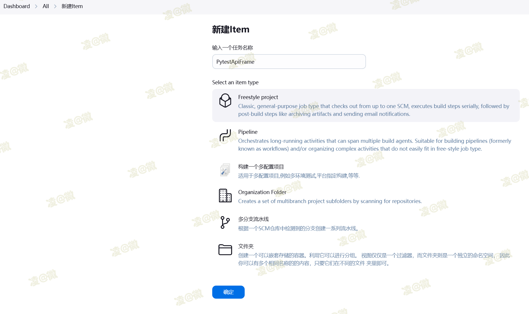 进入Jenkins首页,点击新建item,输入任务名称,选择Freestyle project,点击确定。