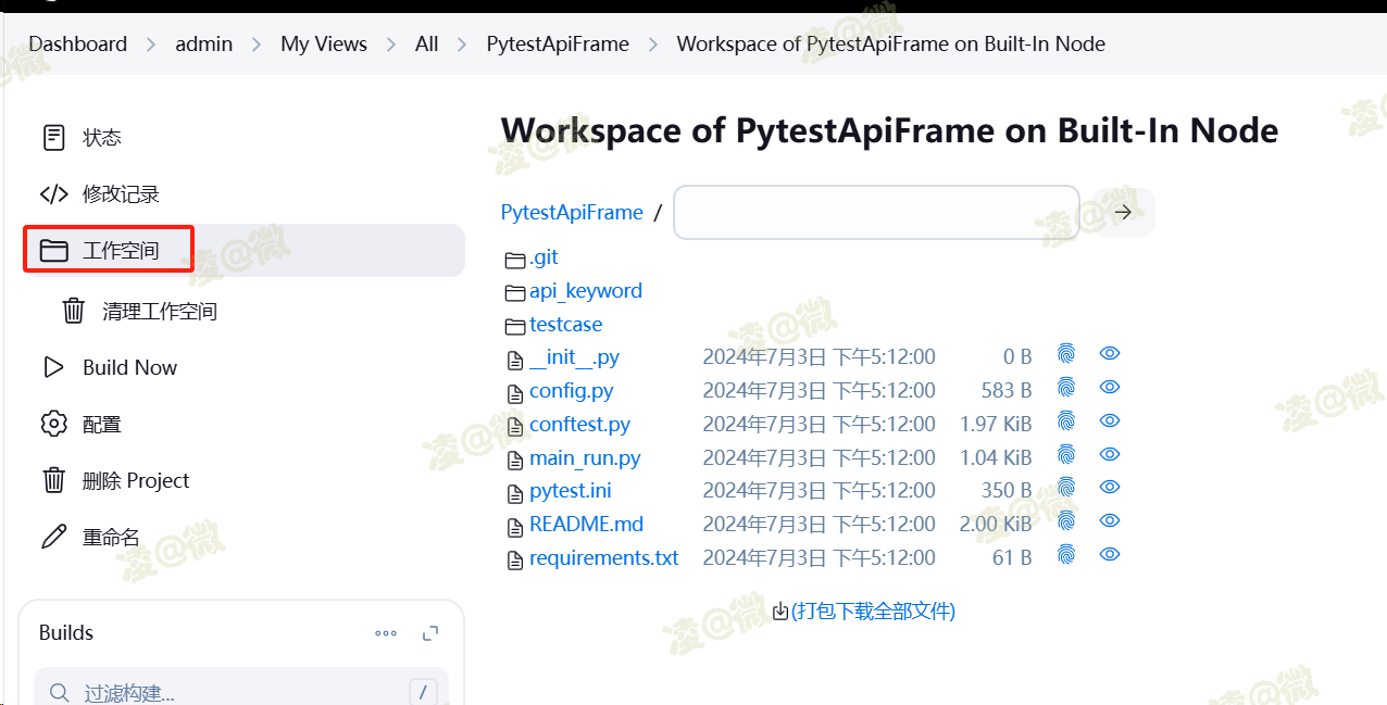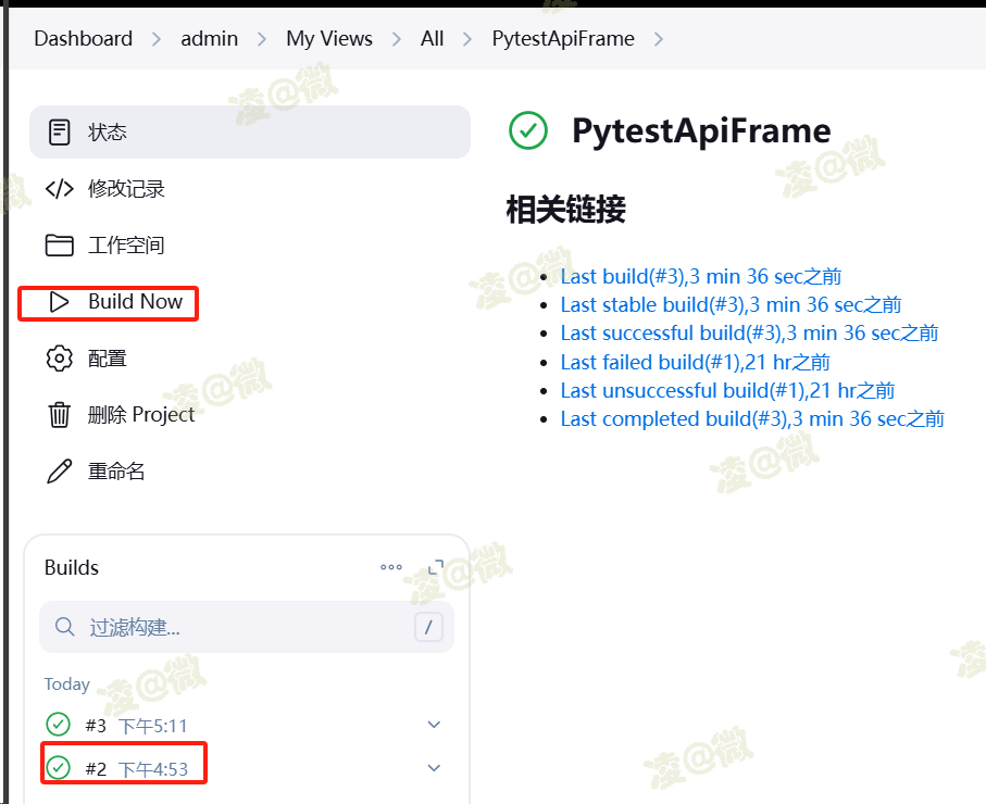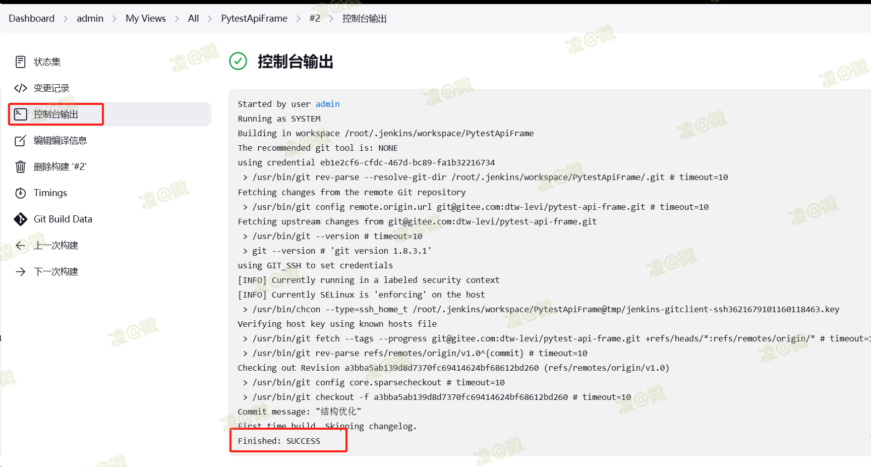 配置完成后,点击保存,我们便可以尝试构建项目;点击build now进行项目的构建;点击构建历史--控制台输出可以查看构建进程日志;进入工作空间可以查看拉取代码详情信息