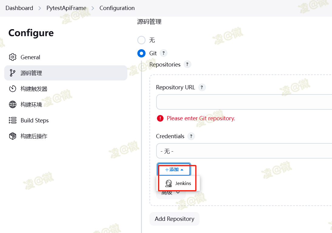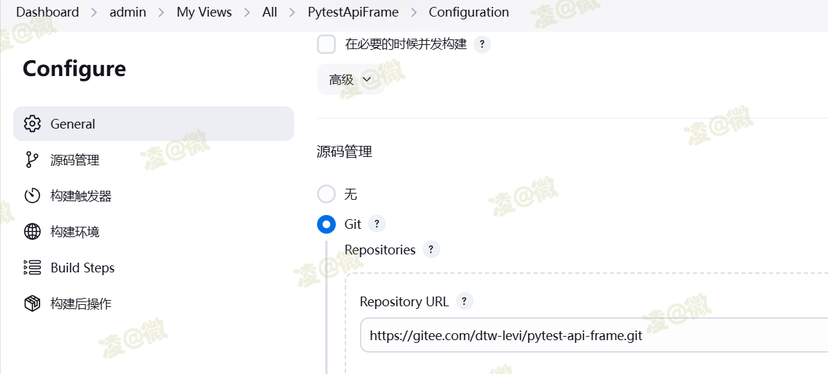 新建成功后点击项目配置页(configure)--源码管理(Source Code Management)--Repository URL输入我们Gitee仓库地址。