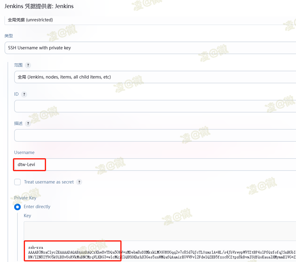 复制服务器git ssh-key私钥:cat /root/.ssh/id_rsa;Jenkins凭证类型选择ssh,填写git账号名,勾选enter directly,将私钥粘贴到凭证内,保存