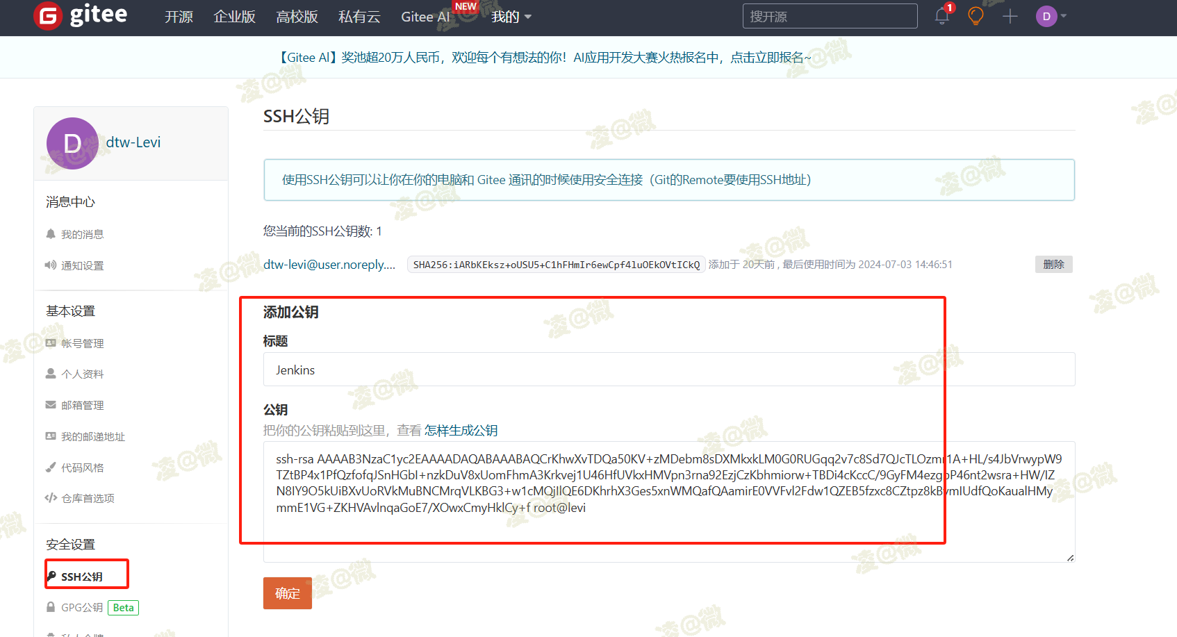 复制服务器git ssh-key公钥:cat /root/.ssh/id_rsa.pub,粘贴到gitee--设置--安全设置SSH公钥内