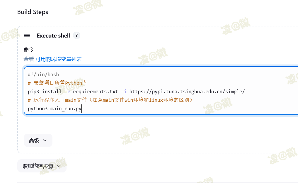 进入项目配置页--build setps--增加构建步骤--选择Execute shell,编写shell脚本,主要是安装需要的python库和运行程序;保存后,进行构建,查看日志代码执行成功