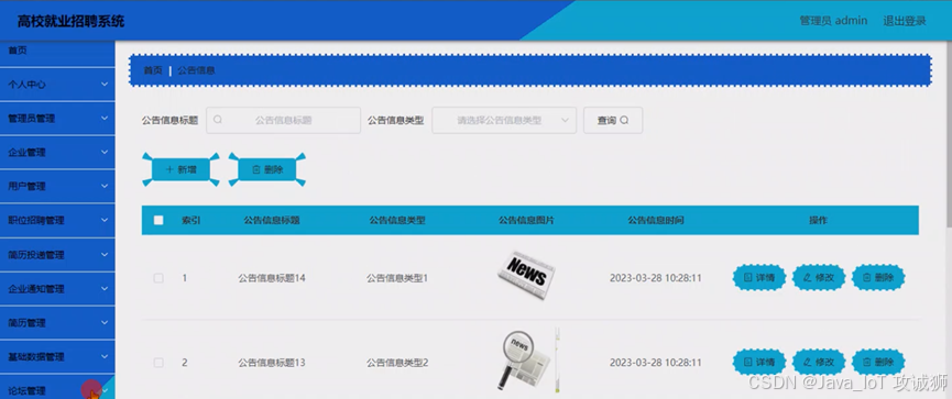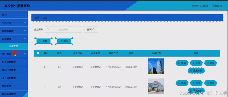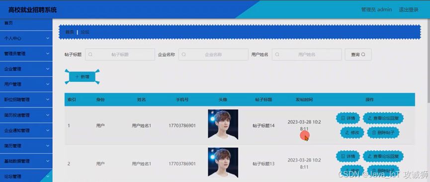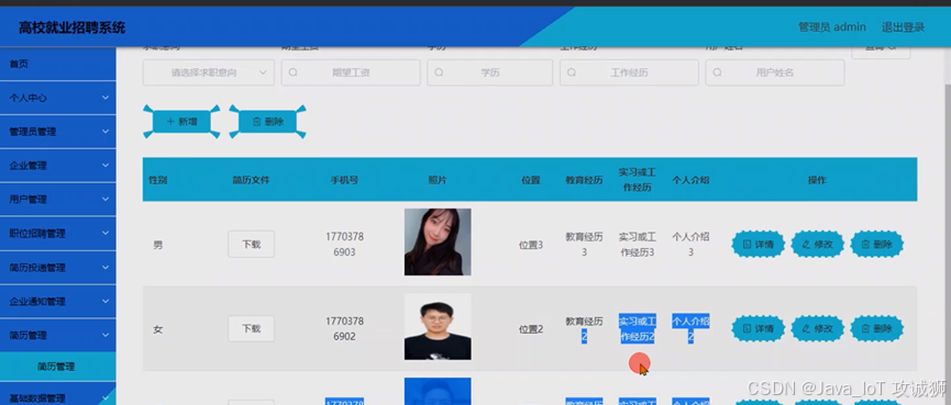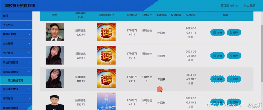 管理员登录进入系统后台可以对个人中心、管理员管理、企业管理、用户管理、职位招聘管理、简历投递管理、企业通知管理、简历管理、基础数据管理、论坛管理、公告信息管理、轮播图信息等功能进行详细操作。企业登录进入系统后台可以对个人中心、职位招聘管理、简历投递管理、企业通知管理、论坛管理、公告信息管理等功能进行详细操作。系统首页是用户注册登录后进入的第一个界面,用户可以对公告信息、企业通知、简历投递、职位招聘、企业、我的等内容进行操作;点击“我的”进入我的管理页面,可以对修改密码,和对简历、公告信息、企业通知、简历投递、职位招聘、职位收藏、职位留言、论坛信息等进行详细操作。
