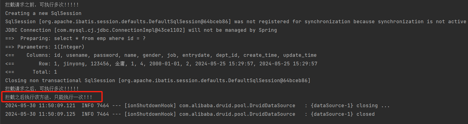 import org.springframework.stereotype.Component; import org.springframework.web.servlet.HandlerInterceptor; import org.springframework.web.servlet.ModelAndView; import javax.servlet.http.HttpServletRequest; import javax.servlet.http.HttpServletResponse; @Component public class MyInterceptor implements HandlerInterceptor { @Override public boolean preHandle(HttpServletRequest request, HttpServletResponse response, Object handler) throws Exception { System.out.println("拦截之前执行的代码"); //返回 true 表示放行;返回 false 表示不放行 return true; } @Override public void postHandle(HttpServletRequest request, HttpServletResponse response, Object handler, ModelAndView modelAndView) throws Exception { System.out.println("访问完资源后,执行的方法!!!!!"); } @Override public void afterCompletion(HttpServletRequest request, HttpServletResponse response, Object handler, Exception ex) throws Exception { System.out.println("最后执行的方法!!!!"); } }