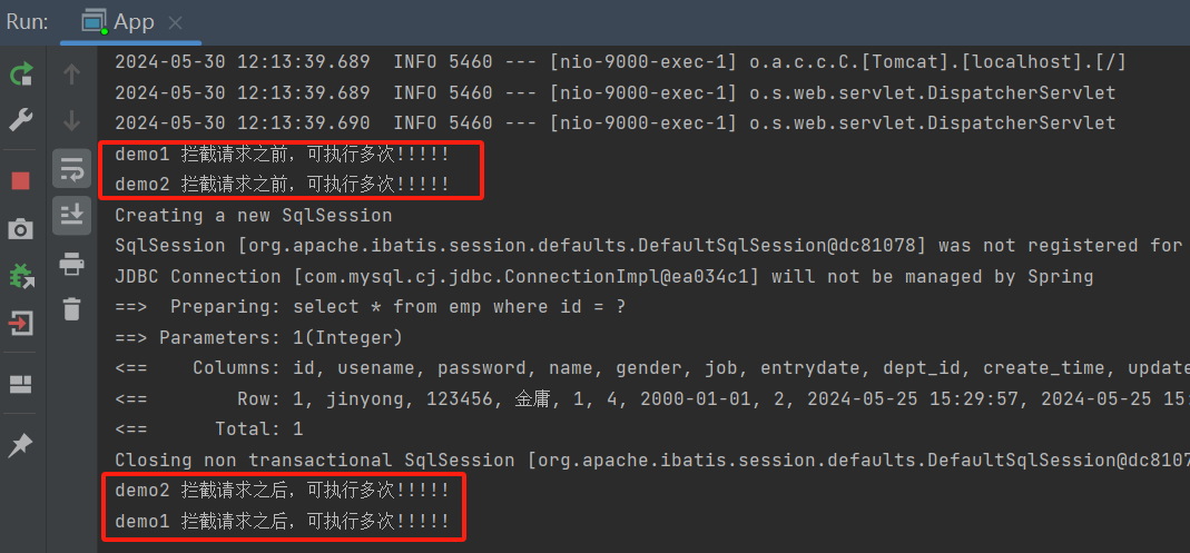 import javax.servlet.*; import javax.servlet.annotation.WebFilter; import java.io.IOException; @WebFilter(urlPatterns = "/*") public class demo1 implements Filter { @Override public void doFilter(ServletRequest servletRequest, ServletResponse servletResponse, FilterChain filterChain) throws IOException, ServletException { //放行之前执行 System.out.println("demo1 拦截请求之前,可执行多次!!!!!"); //放行 filterChain.doFilter(servletRequest,servletResponse); //放行之后执行 System.out.println("demo1 拦截请求之后,可执行多次!!!!!"); } }demo2 代码: