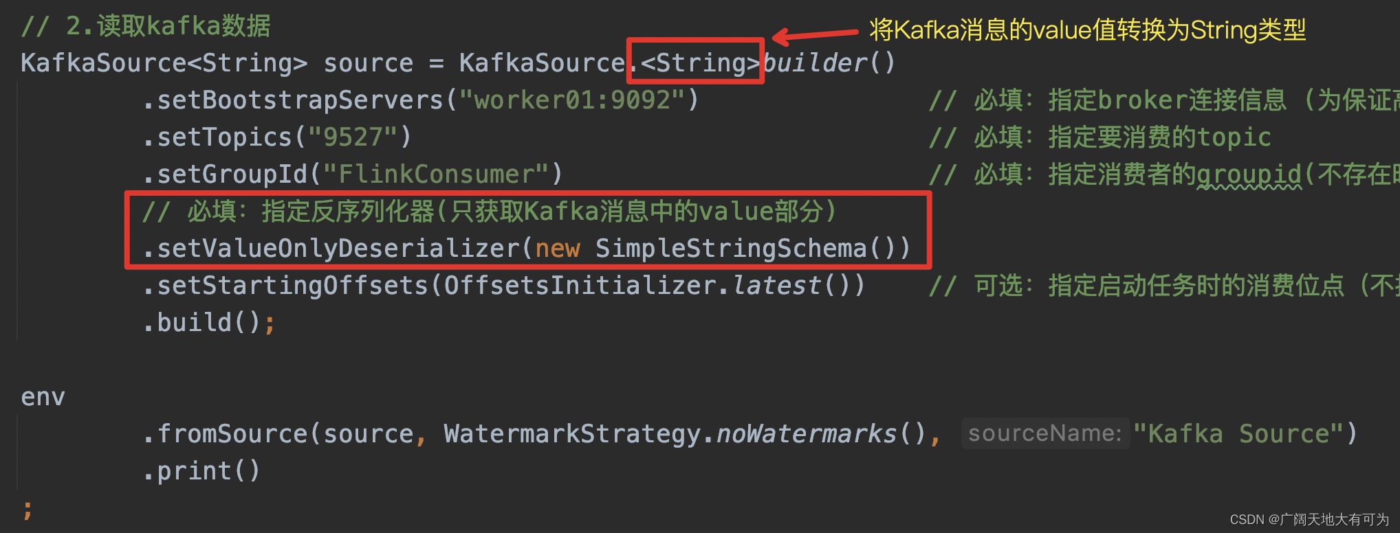 // 1.初始化 KafkaSource 实例 KafkaSource source = KafkaSource.builder() .setBootstrapServers(brokers) // 必填:指定broker连接信息 (为保证高可用,建议多指定几个节点) .setTopics("input-topic") // 必填:指定要消费的topic .setGroupId("my-group") // 必填:指定消费者的groupid(不存在时会自动创建) .setValueOnlyDeserializer(new SimpleStringSchema()) // 必填:指定反序列化器(用来解析kafka消息数据,转换为flink数据类型) .setStartingOffsets(OffsetsInitializer.earliest()) // 可选:指定启动任务时的消费位点(不指定时,将默认使用 OffsetsInitializer.earliest()) .build(); // 2.通过 fromSource + KafkaSource 获取 DataStreamSource env.fromSource(source, WatermarkStrategy.noWatermarks(), "Kafka Source");