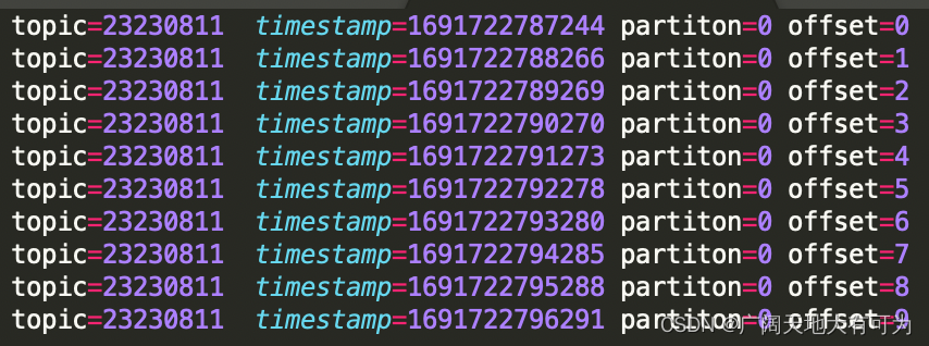 下面用案例说明下,三种设置的效果,kafak生成10条数据,如下: