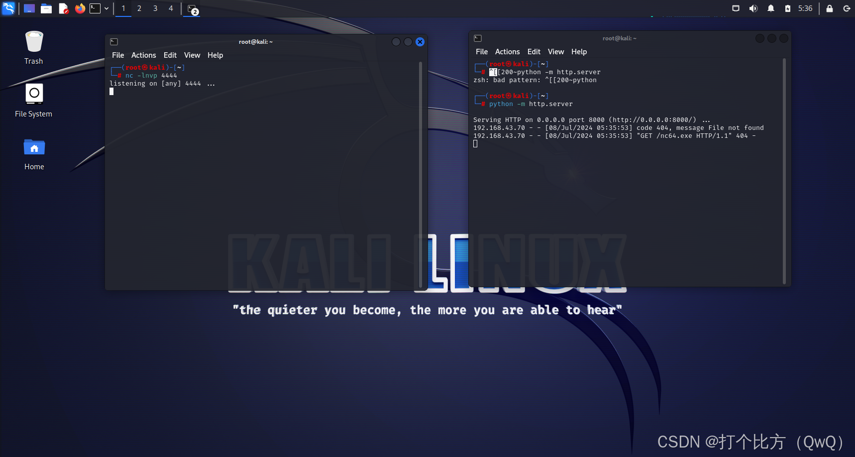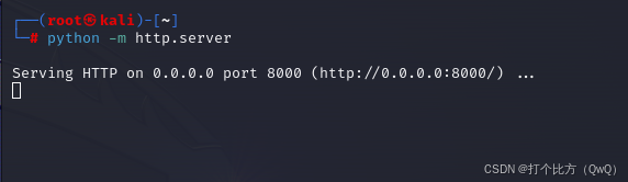 打开kali虚拟机,开启一个终端,输入命令python -m http.server,启动HTTP服务监听,让受害者的机器可以下载该程序。