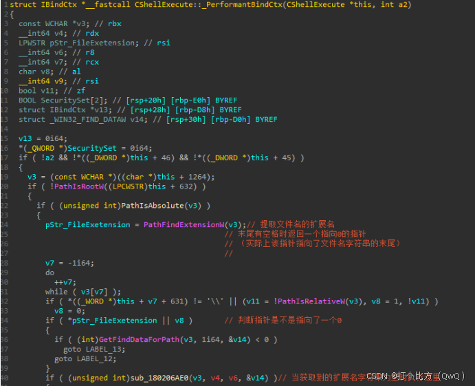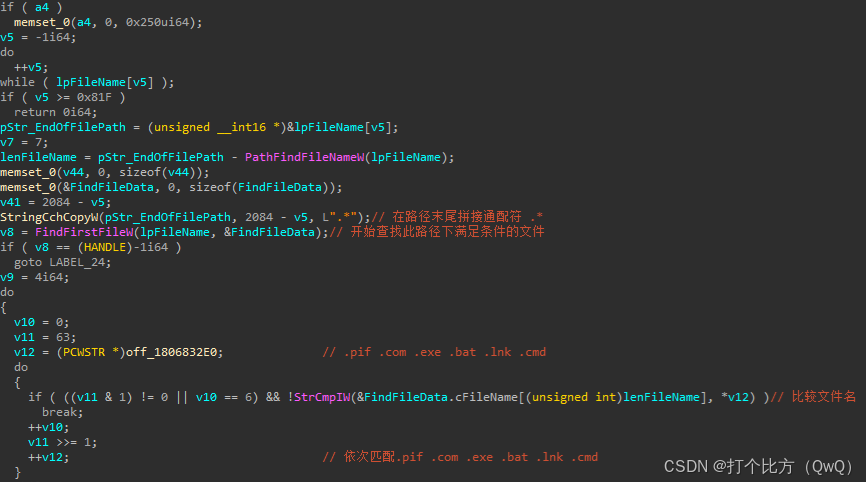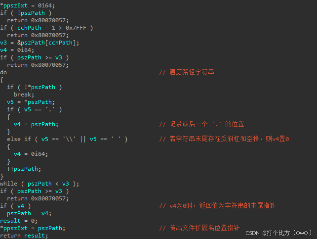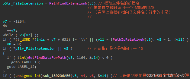 同时,可以看到它调用了另一个函数PathCchFindExtension,这个子函数是提取扩展名字符串的关键函数,代码逻辑也很简单,遍历文件路径字符串,查找末尾“.*”的位置。