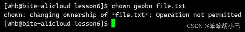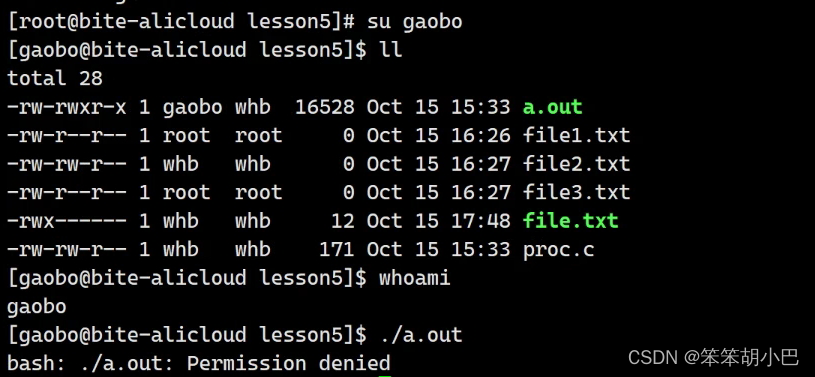 当我们切换到gaobo这个普通用户,此时Linux系统又会再次匹配,此时匹配的就是拥有者,此时就没有可执行的权限。
