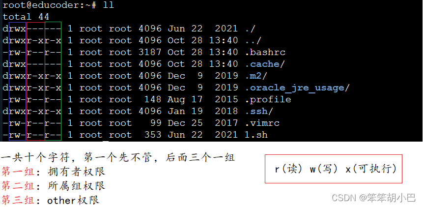 - iii.执行(x/1):execute对文件而言,具有执行文件的权限;对目录来说,具有进入目录的权限