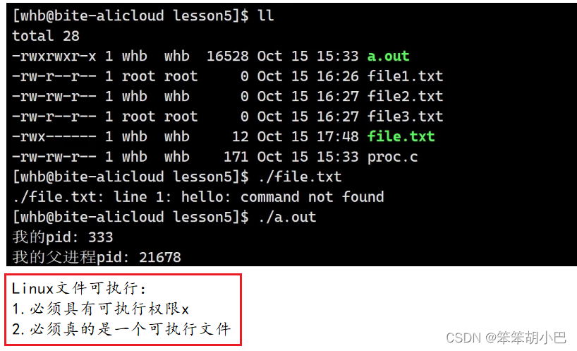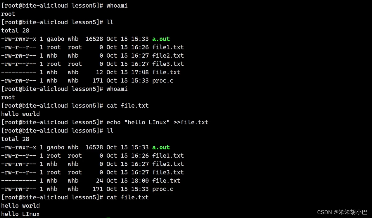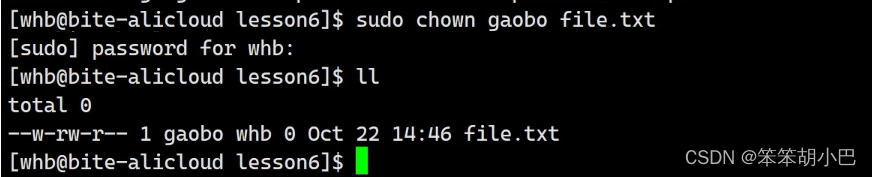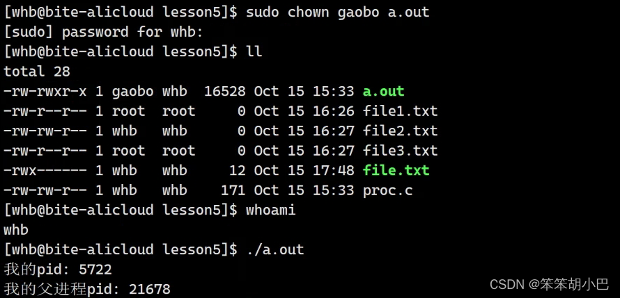 此时拥有者就切换为了gaobo这个用户,但是此时登录的还是whb,此时Linux系统根据当前的用户whb就去匹配到了所属组,从而也就可以执行这个文件了。
