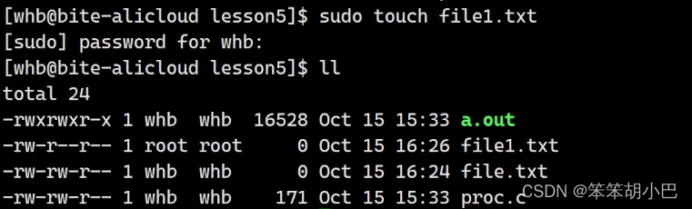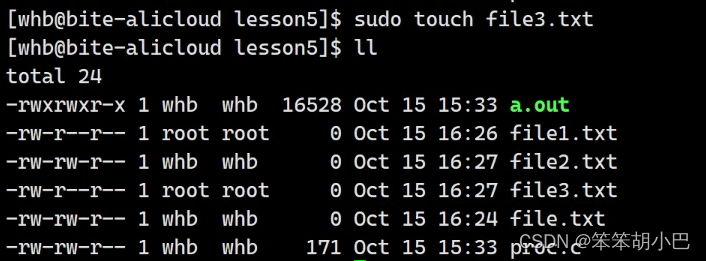 我们后面再以root权限执行指令:sudo touch file3.txt,我们会发现此次不需要输出普通用户的密码就创建出文件了,这是因为曾经sodu输过密码,并且Linux会短暂的记录用户在一段时间执行过sudo命令,是已经做过认证的,所以后面就不需要再输入密码。