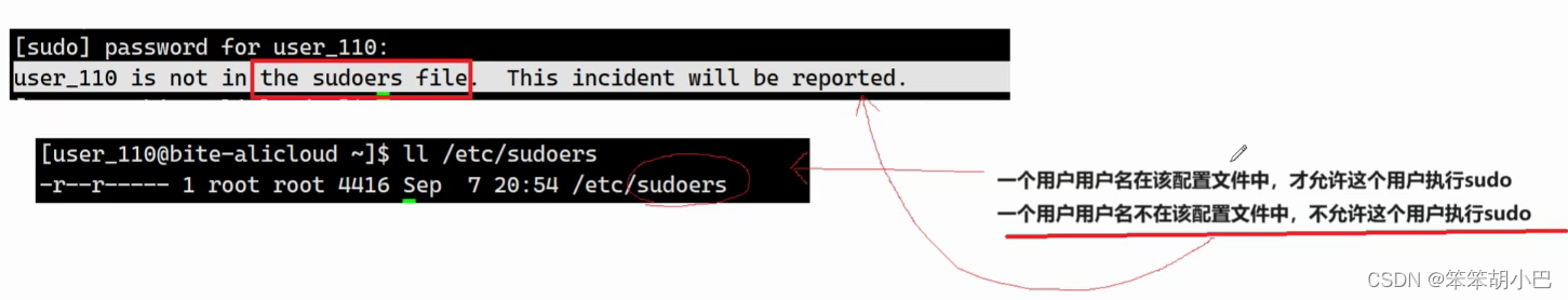 如果我们将用户添加到该配置文件中,那用户是否可以执行sudo吗?当然可以,但是该配置文件(白名单)是root文件,我们普通用户无法自己添加该配置文件,要添加该配置文件必须以root的身份添加。所以能够执行sudo的,一定是历史上曾经经过管理员允许的用户,才能执行sudo,我们上面之所以能执行sudo是因为将sudo touch命令添加到该配置文件