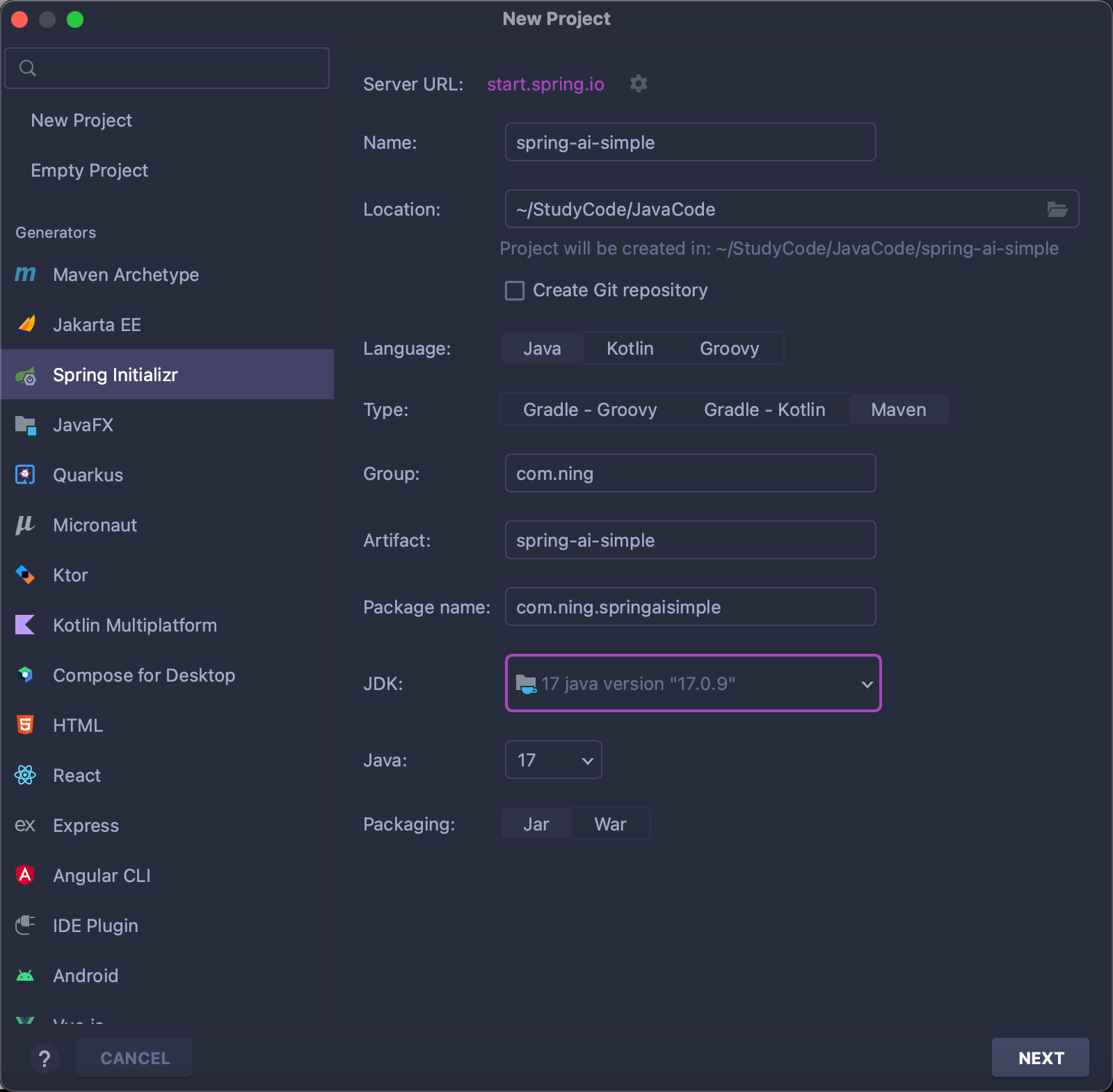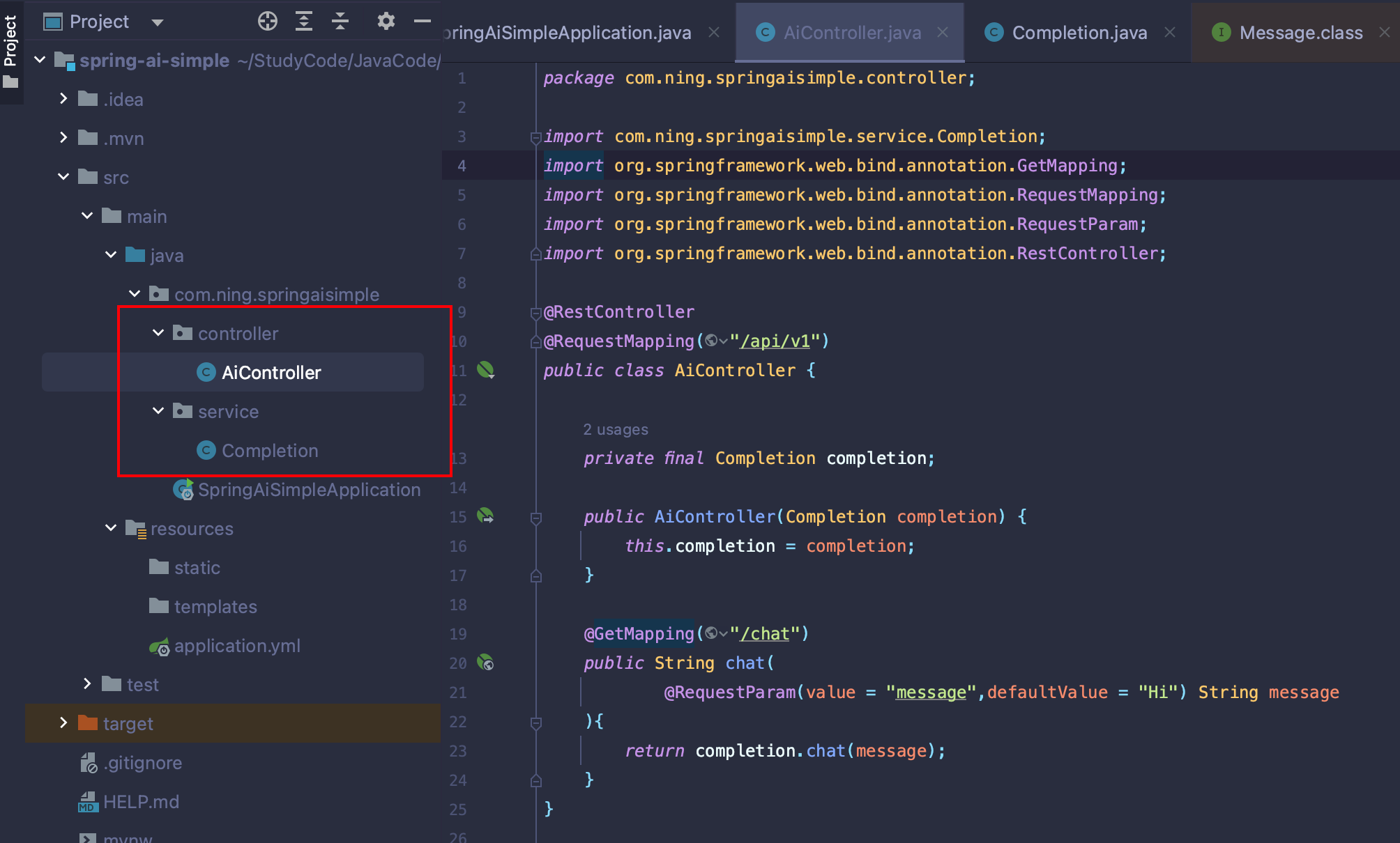 在上面已经谈到过,Spring AI已经集成了OpenAI的API,因此我们不需要实现向OpenAI发送请求和接收响应的交互程序了,Spring AI已经实现了这一内容,我们只需要通过调用Spring AI为我们提供的接口即可。