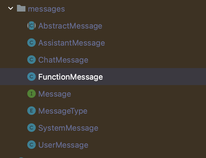 在Spring AI中,这三类聊天消息分别对应UserMessage、AssistantMessage、SystemMessage,它们有一个共同的抽象父类AbstractMessage,该抽象类实现了接口Message。