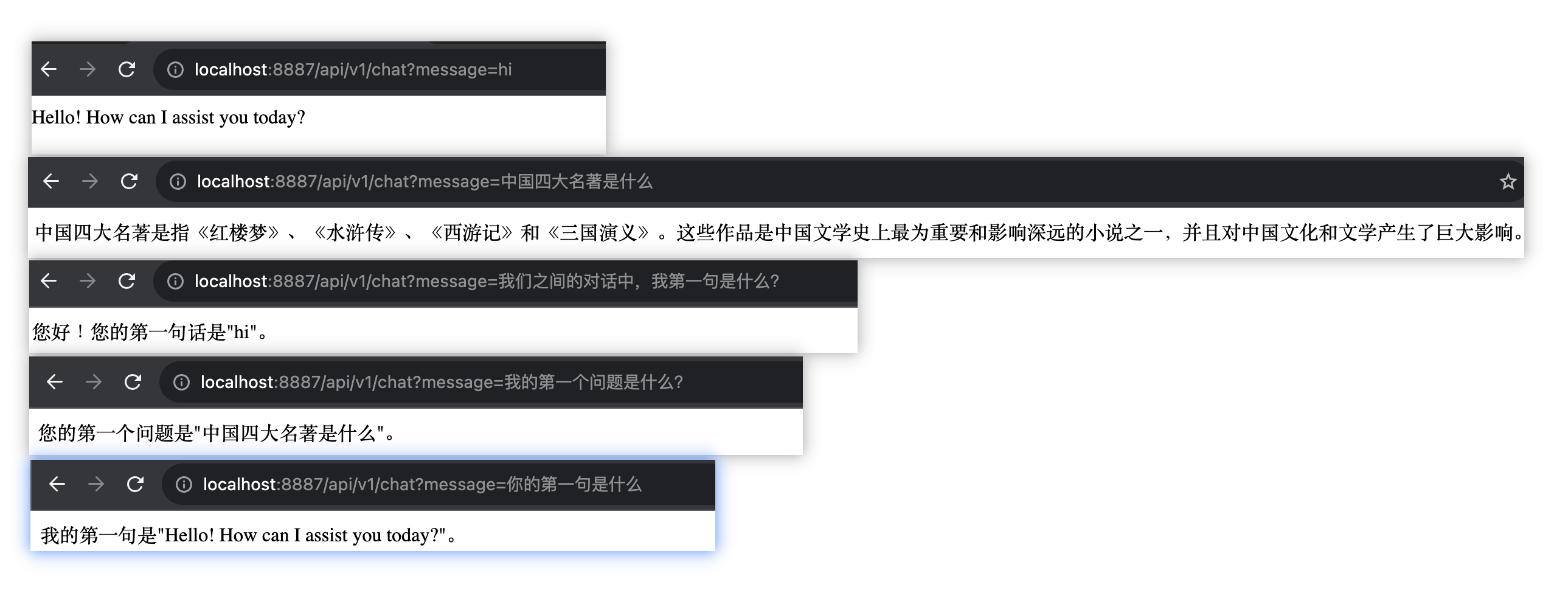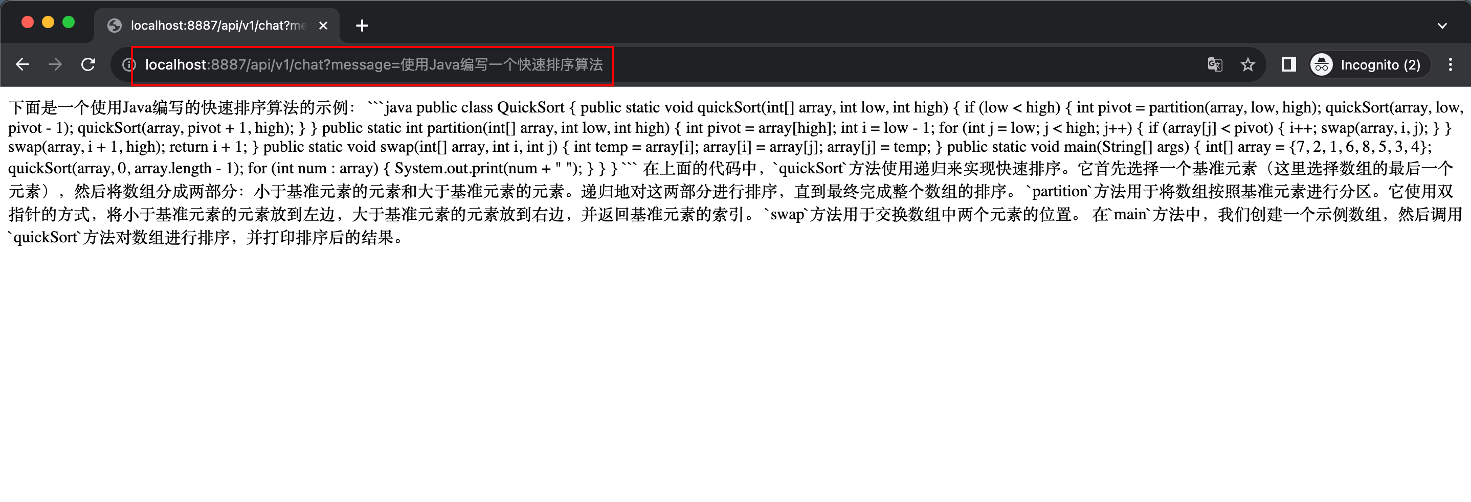 编写完毕后,启动SpringBoot即可。通过浏览器访问localhost:端口号/api/v1/chat?message=你的问题进行测试。