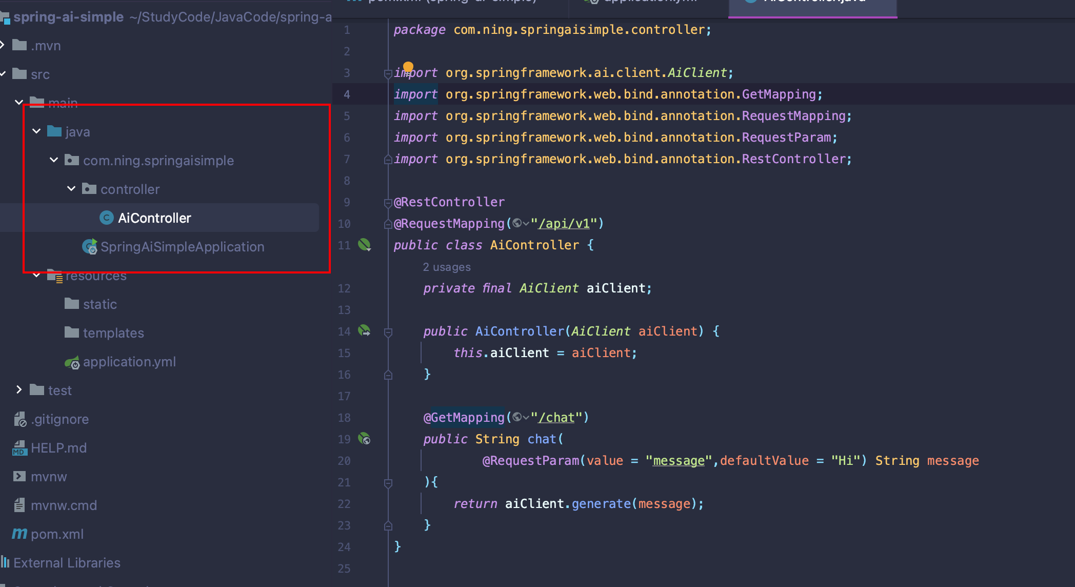Spring Ai可以非常简便、快速的完成ChatGPT的调用。这里先创建一个AiController类体验体验。