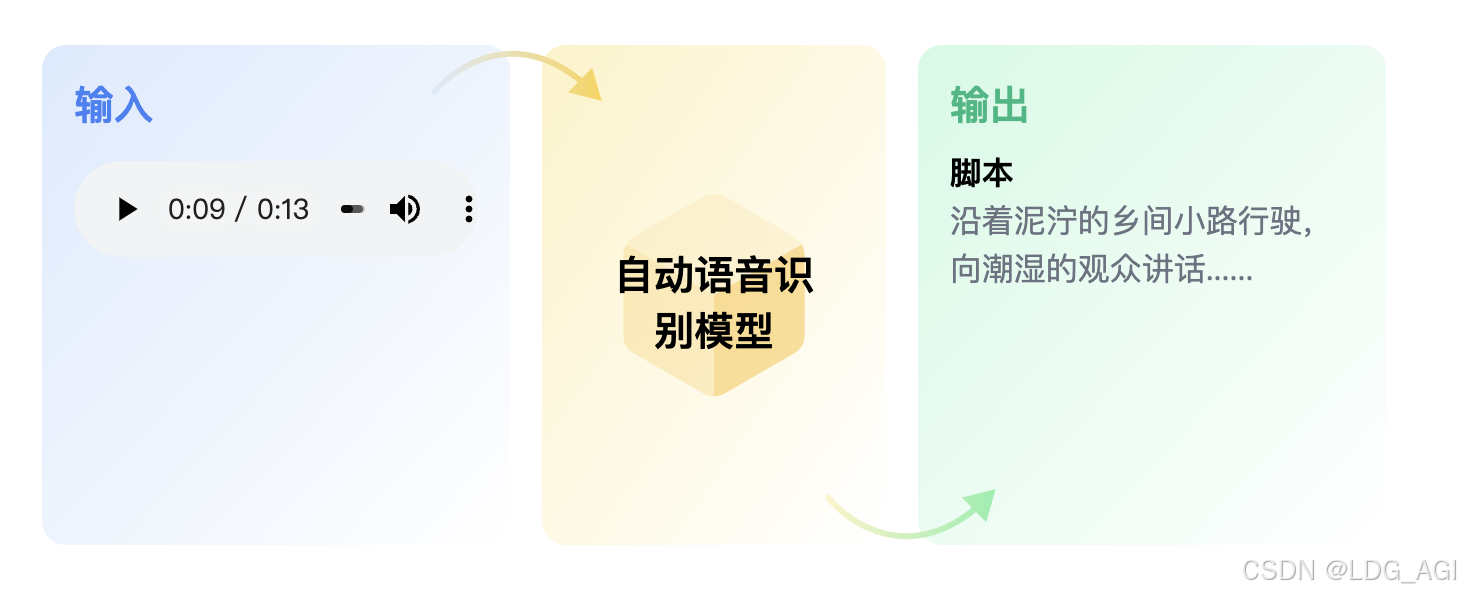 自动语音识别 (ASR),也称为语音转文本 (STT),是将给定音频转录为文本的任务。主要应用场景有人机对话、语音转文本、歌词识别、字幕生成等。