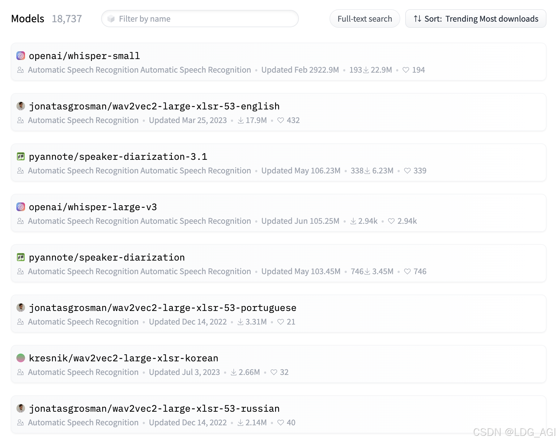 {'text': " Well, today's story meeting is officially started. Someone said that you have been telling stories for two or three years for such a long time, and you still have a story meeting to tell."} 在huggingface上,我们筛选自动语音识别模型,并按下载量从高到低排序: