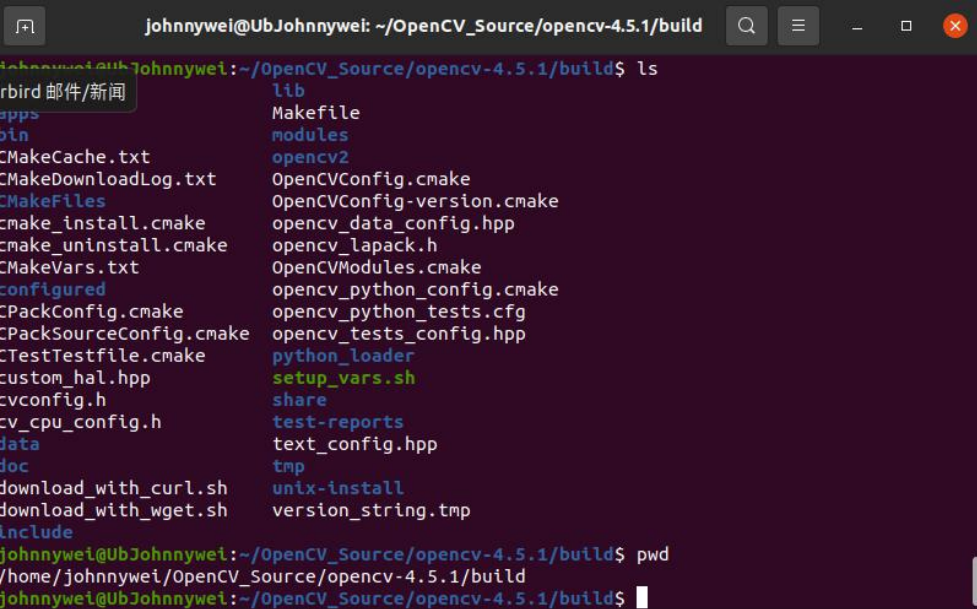 【johnnywei@UbJohnnywei:~/OpenCV_Source/opencv-4.5. 1/build】$ sudo cmake -D CMAKE_BUILD_TYPE=Release -D CMAKE_INSTALL_PREFIX=/usr/local -D OPENCV_EXTRA_MODULES_PATH=/home/johnnywei/Ope nCV_Source/opencv-4.5.1/opencv_contrib-4.5.1/modules/ ..