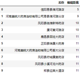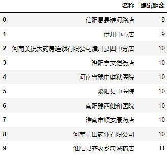 我们任取2个结果为信阳息县淮河路店地址看看编辑距离最小的前10个地址和编辑距离: