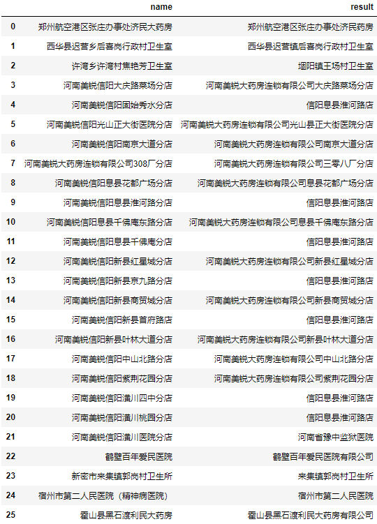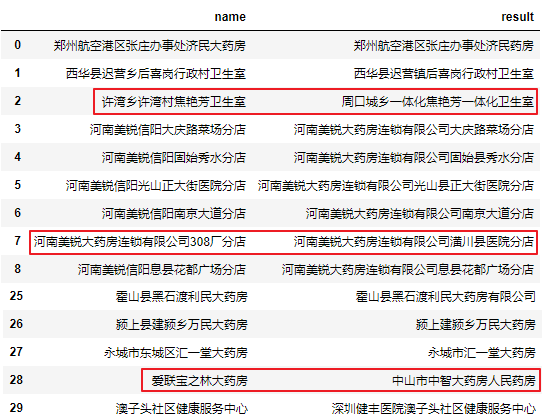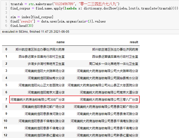 可以看到除了数据库本来不包含正确名称的爱联宝之林大药房外还剩下河南美锐大药房连锁有限公司308厂分店匹配不正确。这是因为不能识别出308的语义等于三零八。如果这类数据较多,我们可以先将被查找的数据统一由小写数字转换为大写数字(保持与数据库一致)后,再分词处理: