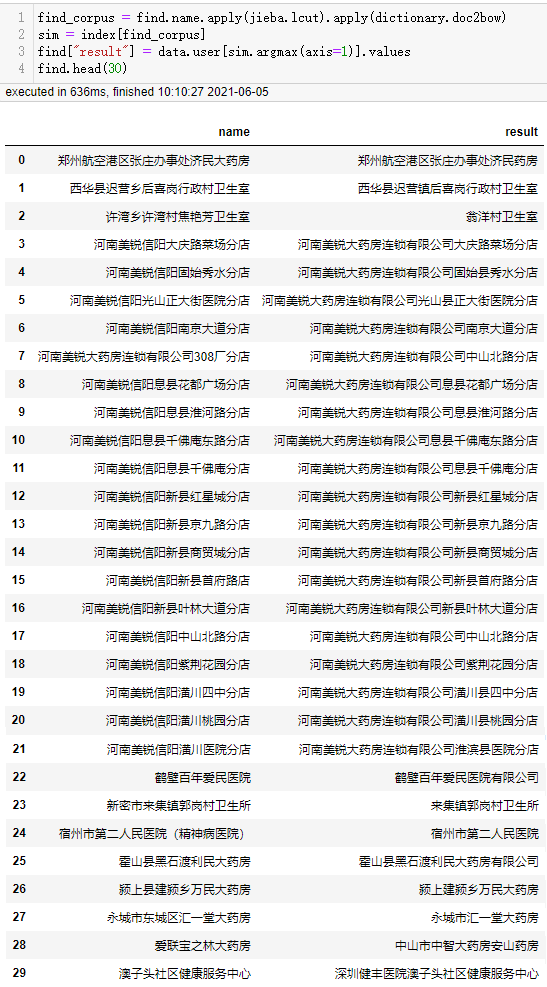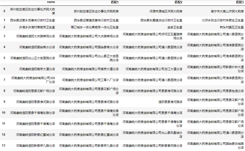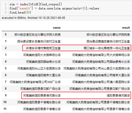 可以看到许湾乡许湾村焦艳芳卫生室匹配正确了,但河南美锐信阳息县淮河路分店又匹配错误了,这是因为在TF-IDF模型中,由于美锐在很多条数据中都出现被降权。