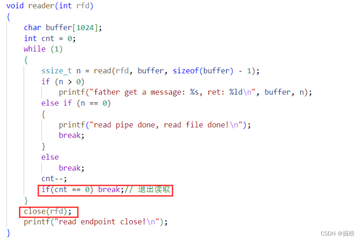 void reader(int rfd) { char buffer[1024]; while (1) { ssize_t n = read(rfd, buffer, sizeof(buffer) - 1); if (n > 0) printf("father get a message: %s, ret: %ld\n", buffer, n); else if (n == 0) { printf("read pipe done, read file done!\n"); break; } else break; } }