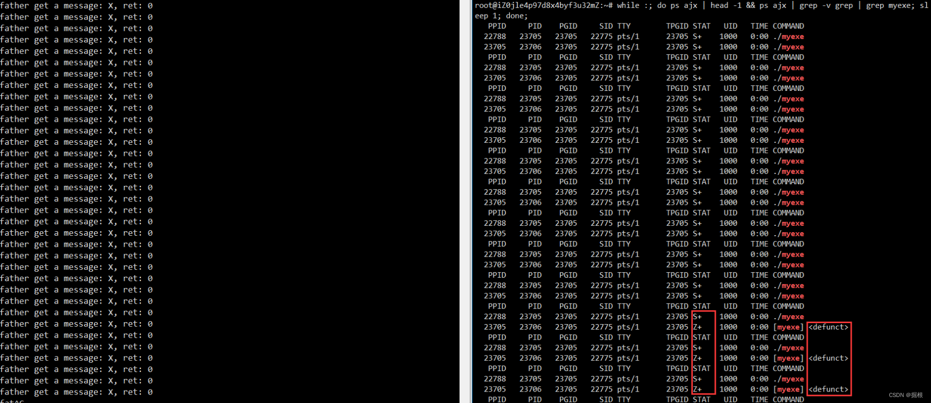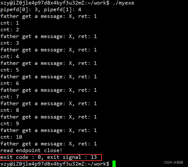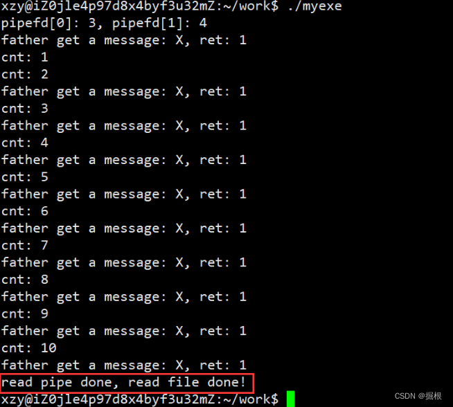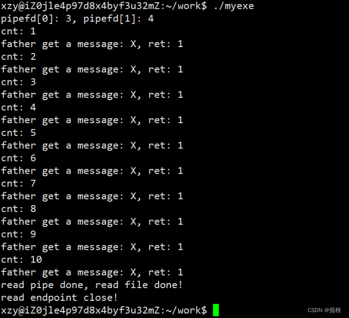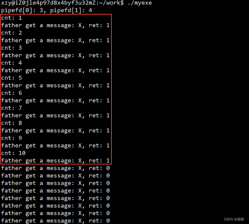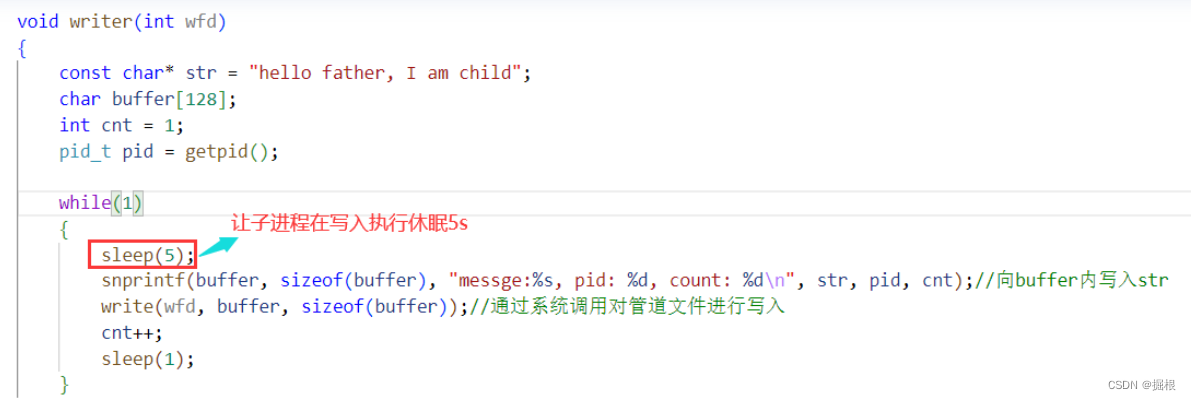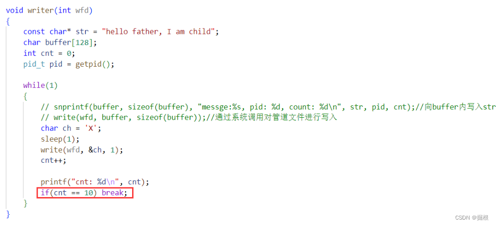 void writer(int wfd) { const char* str = "hello father, I am child"; char buffer[128]; int cnt = 0; pid_t pid = getpid(); while(1) { // snprintf(buffer, sizeof(buffer), "messge:%s, pid: %d, count: %d\n", str, pid, cnt);//向buffer内写入str // write(wfd, buffer, sizeof(buffer));//通过系统调用对管道文件进行写入 char* ch = "X"; write(wfd, ch, 1); cnt++; printf("cnt: %d\n", cnt); } }