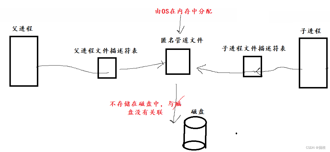 匿名管道的创建, 不会指定打开文件的文件名、文件路径等, 即不会有目标的打开文件