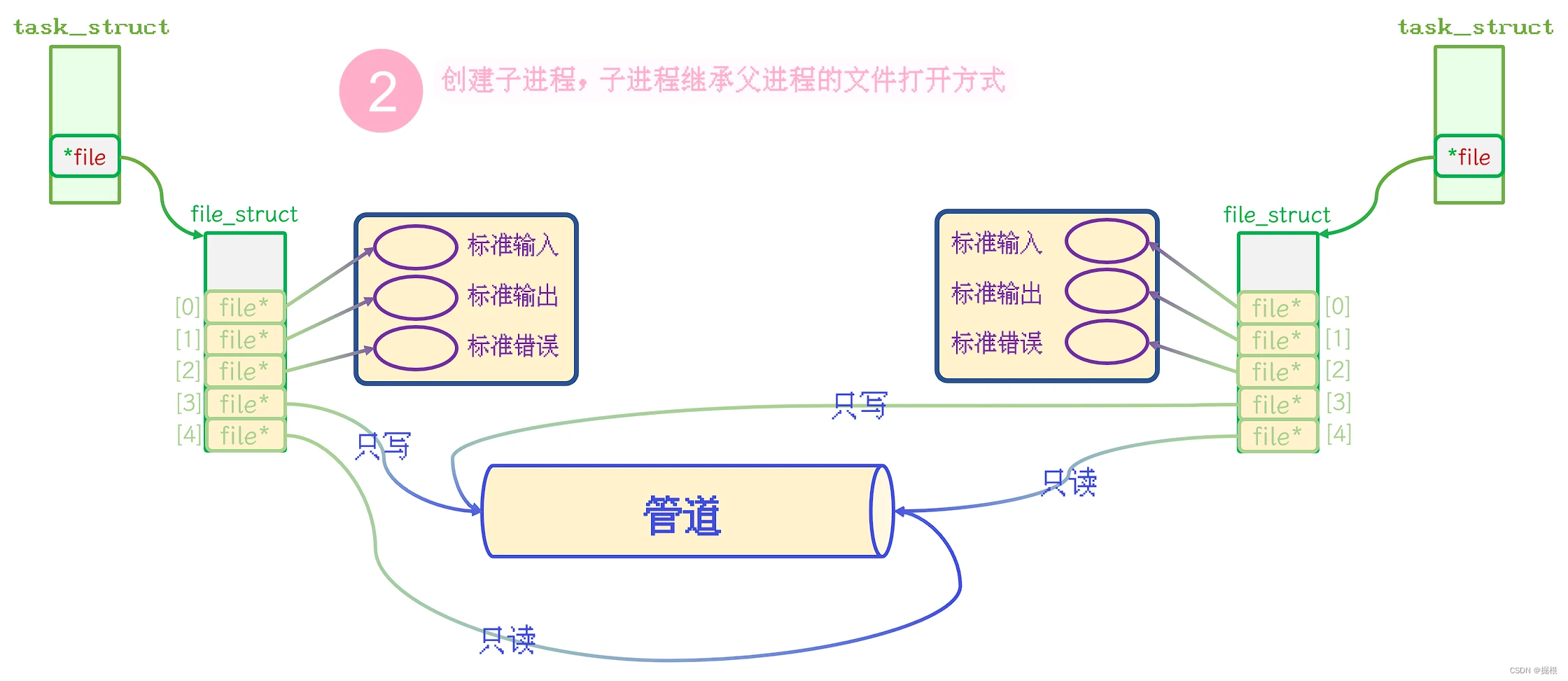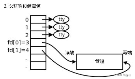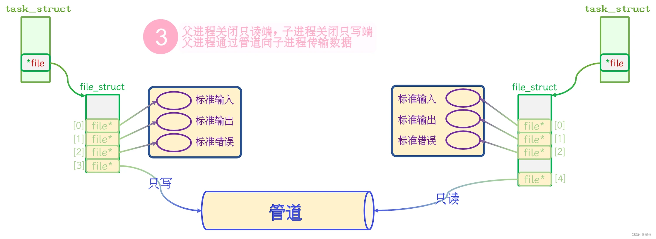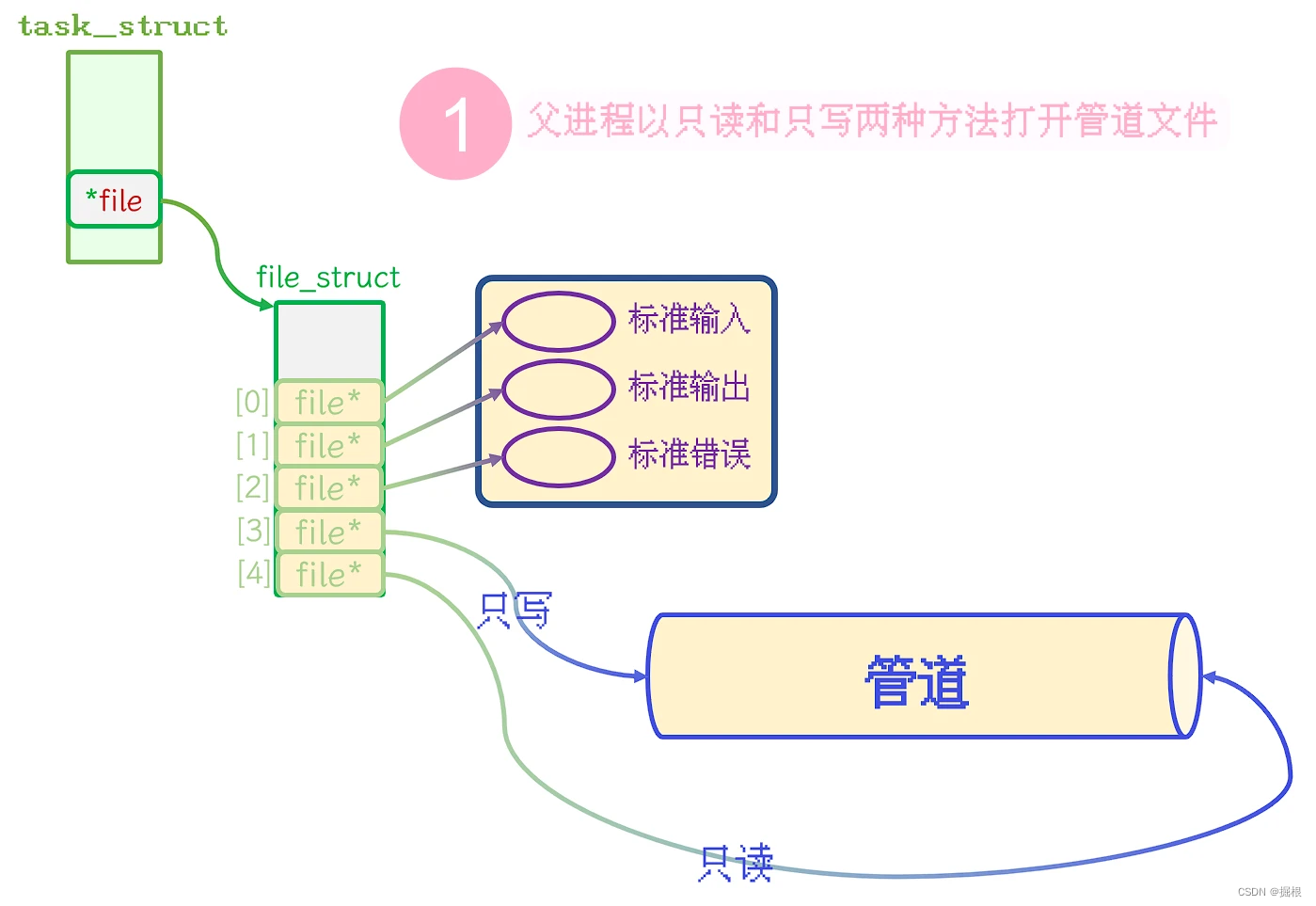 pipe[0], 存储以 只读方式 打开管道时获得的fdpipe[1], 存储以 只写方式 打开管道时获得的fd之后就可以根据需求, 选择父子进程的端口关闭