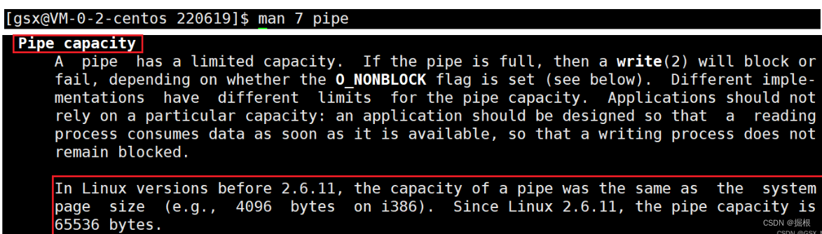 根据man手册,在2.6.11之前的Linux版本中,管道的最大容量与系统页面大小相同,从Linux 2.6.11往后,管道的最大容量是65536字节。