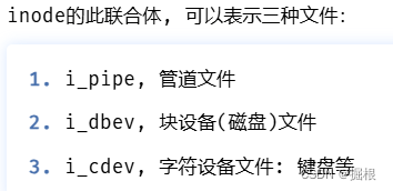 这个处于inode结构体中的联合体, 其实就是为了标识这个文件的类型, 其中pipe 就表示此文件的类型是管道文件.