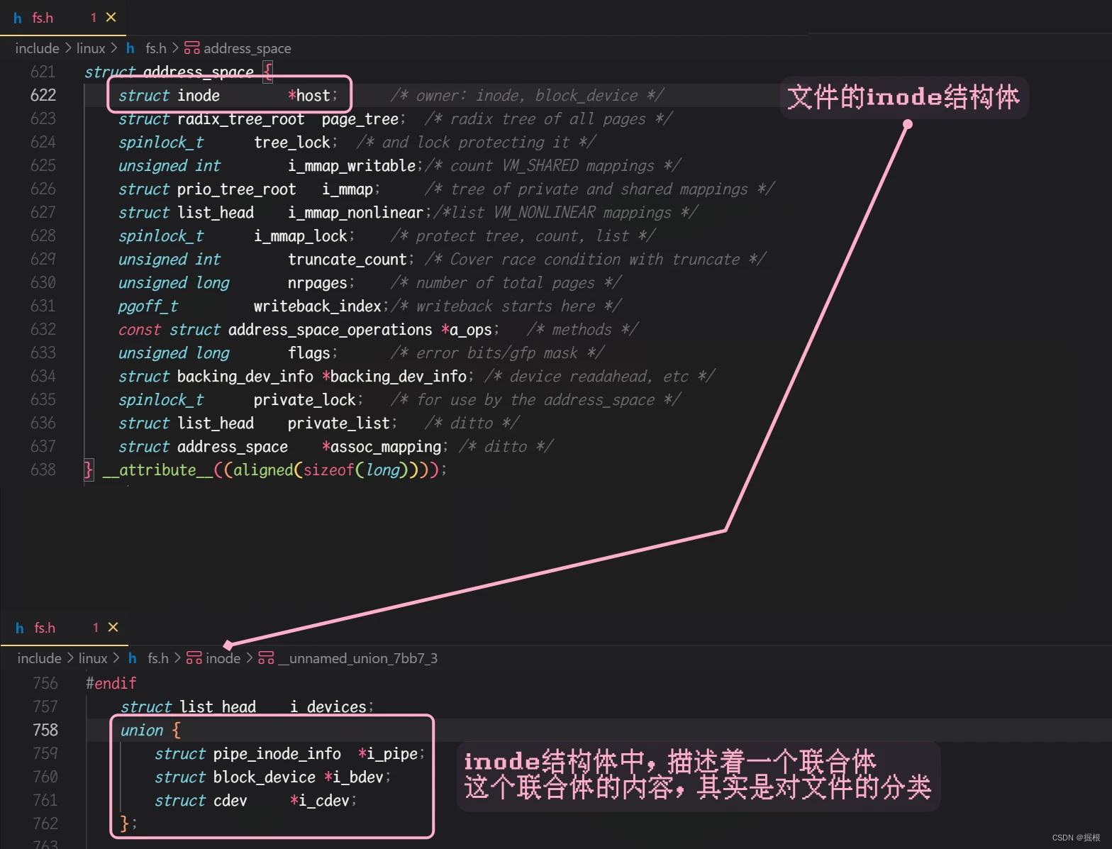 缓冲区信息中, 包含着描述文件的inode结构体, 而inode结构体中其实描述着一个联合体:
