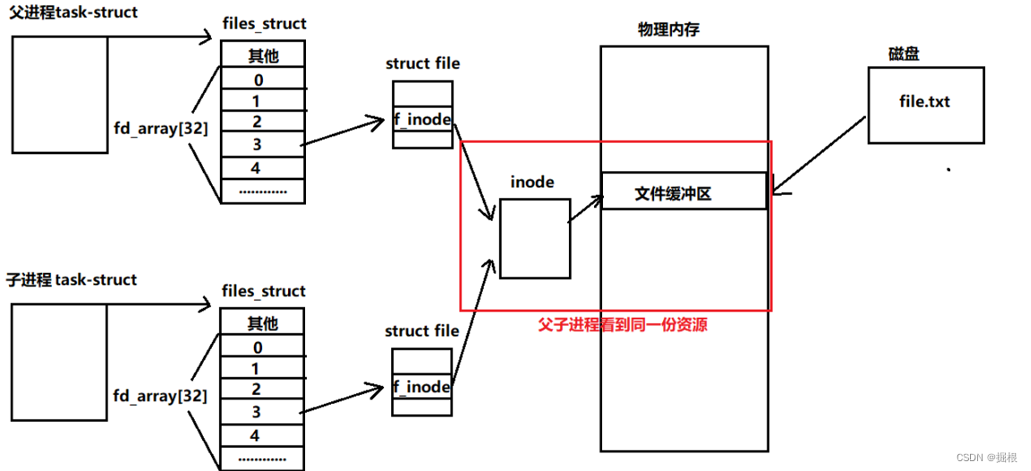 子进程拷贝父进程的fd_array,父子进程看到同一份文件 , 这里父子进程看到的同一份文件资源是由操作系统来维护的,所以当父子进程对该文件进行写入操作时,该文件缓冲区当中的数据并不会进行写时拷贝(文件并不存在磁盘,只在内存中存在)。