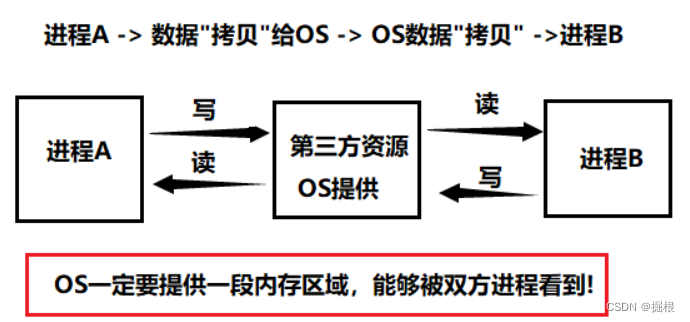 各个进程之间若想实现通信,一定要借助第三方资源,这些进程就可以通过向这个第三方资源写入或是读取数据,进而实现进程之间的通信,这个第三方资源实际上就是操作系统提供的一段内存区域。