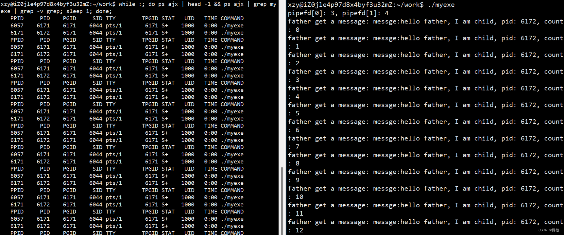 2. 细心的小伙伴可能会有疑惑,父进程只向管道中写入一次数据,子进程读取一次就应该将数据读取完了呀,子进程循环一次就该进入堵塞,而运行结果显示子进程的循环进行了两次呢?
