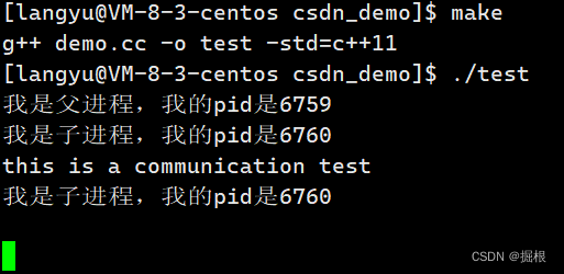 #include #include #include #include #include #include #include #include int main() { int fd[2]; int check = pipe(fd);//声明创建管道 if (check != 0) { printf("create pipe error"); return 0; } char test_buff[64] = "this is a communication test"; pid_t id = fork(); if (id > 0) { close(fd[0]); write(fd[1], test_buff, sizeof(test_buff)); wait(); } if (id == 0) { close(fd[1]); memset(test_buff, 0, sizeof(test_buff)); read(fd[0], test_buff, sizeof(test_buff)); printf("测试结果:%s\n", test_buff); } return 0; }