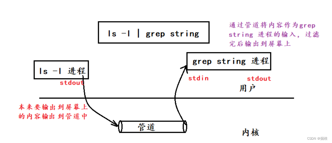 要输出到屏幕上的数据通过管道输出到grep这个进程中,作为grep这个进程的输入;- 然后这个进程