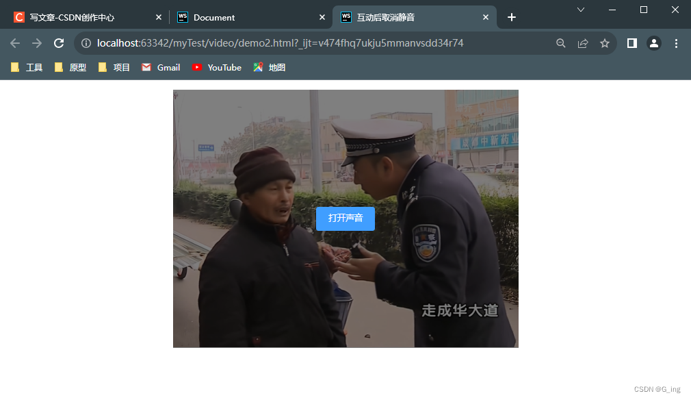 进入页面后静音播放视频,然后判断是否允许自动播放,如果允许,则取消静音,但我们这里不允许,所以显示打开声音按钮。