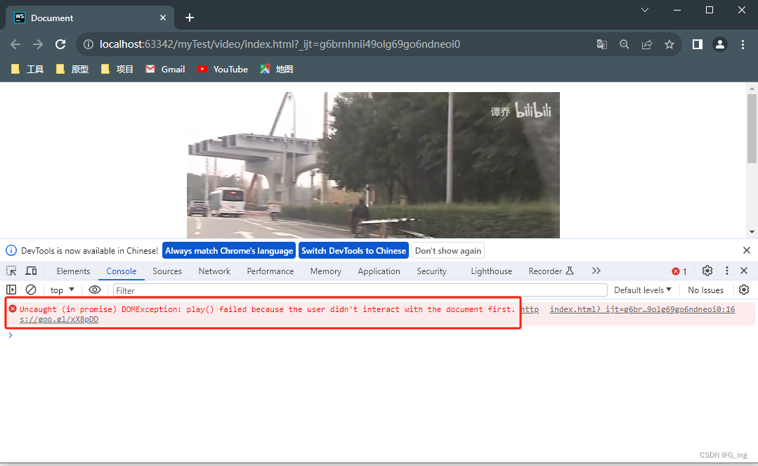 首先呢,我们直接在用户进入页面的时候play(),可以发现视频并没有播放,并且报错Uncaught (in promise) DOMException: play() failed because the user didn't interact with the document first