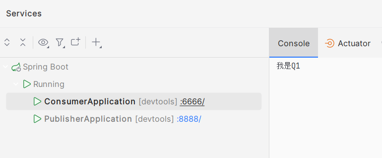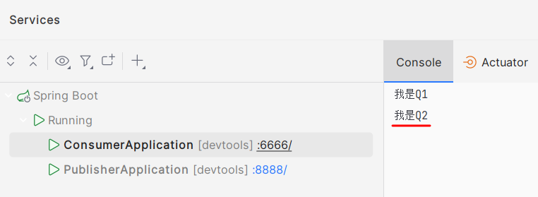 package com.ycxw.consumer.demos; import org.springframework.amqp.rabbit.annotation.RabbitHandler; import org.springframework.amqp.rabbit.annotation.RabbitListener; import org.springframework.stereotype.Component; import java.util.Map; @Component public class TopicReceiver { @RabbitListener(queues = {"topic-Q1"}) @RabbitHandler public void handler(String msg){ System.out.println("已接受到队列topic-Q1传递过来的消息:"+msg); } @RabbitListener(queues = {"topic-Q2"}) @RabbitHandler public void handlerB(String msg) { System.out.println("已接受到队列topic-Q2传递过来的消息:" + msg); } } Q1队列:
